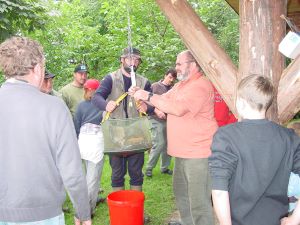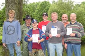 Manfred Laumer siegte beim Abfischen mit 9200 g gefangenen FischenZum Abfischen, der letzten offiziellen Veranstaltung der Anglerfreunde im Jahr, konnte Vorstand Ludwig Aschenbrenner die Teilnehmer begrüßen. Er dankte allen für ihr Engagement im abgelaufenen Jahr. 12 Altfischer und 9 Jungfischer hatten sich eingefunden, mit der Teilnahme zeigte er sich sehr zufrieden. Sieger wurde Manfred Laumer mit 9200 g (3 Karpfen und 1 Brachse). Auf Platz 2 folgte Arnold Multerer jun. (5260 g – 6 Döbel) vor Alois Weißthanner (3960 g – 1 Karpfen und 1 Döbel). Auf den weiteren Plätzen folgten Reinhold Christl (2300 g – Karpfen), Jürgen Leist (1640 g – Karpfen) und Reinhold Buchinger (1100 g – Hecht). Bei den Jungfischern siegte Matthias Christl mit einer 1520 g schweren Brachse. Platz 2 belegte Michael Heitzer (360 g). Am Grillplatz saß man noch in gemütlicher Runde bei Grillspezialitäten und Getränken, die der Verein spendierte, zusammen. Die Gewinner des Abfischen 2006 zusammen mit dem 1.Vorsitzenden Ludwig Aschenbrenner. |