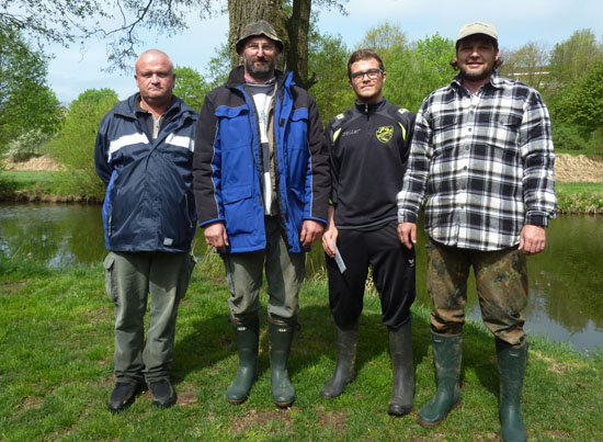 Daniel Konadl Sieger beim AnfischenBei etwas kühlem, aber trockenem Wetter konnten die Anglerfreunde am vergangenen Sonntag mit ihrem ersten Wettbewerb, dem Anfischen, in die neue Saison starten. Wenig zufrieden zeigten sich die 9 Altfischer mit ihren Fangergebnissen. Schuld daran war sicher auch der extreme Wasserniedrigstand. Nach der Auslosung der Gewässerabschnitte gingen die Teilnehmer an den Start. Gegen 11.00 Uhr traf man sich beim Grillplatz zum Abwiegen. Karpfen, Brachsen und Giebel wurden gefangen. Als Sieger ging schließlich Daniel Konadl mit 11.600 g (4 Karpfen, 2 Giebel, 1 Brachse) hervor. Auf den nächsten Plätzen folgten Wolfgang Mühlbauer (8900 g – 2 Karpfen) und Armin Steinhofer ( 900 g – 1 Brachse).). Vorstand Thomas Konadl nahm die Siegerehrung vor und gratulierte zu den Erfolgen. Die Sieger wurden von ihm mit Punktekarten ausgezeichnet. Im Anschluss saß man noch in geselliger Runde bei Grillfleisch und Getränken gemütlich am Grillplatz zusammen. Vorstand Thomas Konadl mit den Gewinnern Wolfgang Mühlbauer, Daniel Konadl, Armin Steinhofer (von links) |
