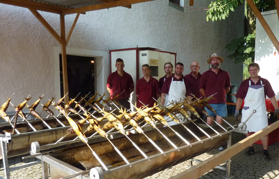 Das „Grillteam“ zusammen mit Vorstand Thomas Konadl (3. v. rechts) hatte mit den "Steckerlfischen", wiederum eine besondere Spezialität der Anglerfreunde im Angebot. |