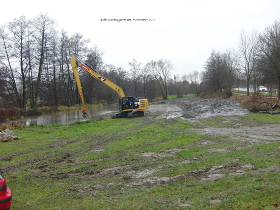 Lohe auf Höhe der sogenannten "Andredlbrücke" vom Schlamm geräumtDas Wasserwirtschaftsamt hat die Lohe vom Schlamm geräumt. Bereits im Juli 2016 stellten die Anglerfreunde den Antrag zur Instandsetzung des Erdwalls und der Räumung der Lohe. Diese ist total verlandet und auch die Erdwallabtrennung vom Urwasser ist gebrochen. Dieser Abschnitt ist nicht sehr strömungsreich, jedoch bei Hochwasser schnell fließend. Deshalb ist es wichtig, für die Fische diese Ruhezone wieder herzustellen. Aus ehemals ca. 1,50 m Wassertiefe sind in der Zwischenzeit im Durchschnitt nur noch ca. 0,30 m Wassertiefe geworden. Es wurde daher im Laufe der Zeit eine regelrechte Fischfalle, aus der die Fische schwer wieder zurück in das Urwasser können, da sich bei der Verbindung zum Urwasser die Wassertiefe extrem verringert und auch durch Äste und dergleichen blockiert ist. Auch wäre es eine perfekte Laichstube und zugleich ein hervorragendes Winterlager für die verschiedenen Fischarten in diesem Gewässerabschnitt. Nach dem die vom Wasserwirtschaftsamt geforderten Eigenmassnahmen von Anglerfreunden erledigt wurden begann Ende November die Fa. Schönberger aus Chamerau mit den Arbeiten. Nun hat die Lohe wieder eine entsprechende Tiefe und auch oberhalb der Brücke wurden Reinigungsmassnahmen vom Wasserwirtschaftsamt durchgeführt. Mit Steinen wurde der Damm wieder abgedichtet und so eine gelungene Ruhezone für Fische hergestellt.
