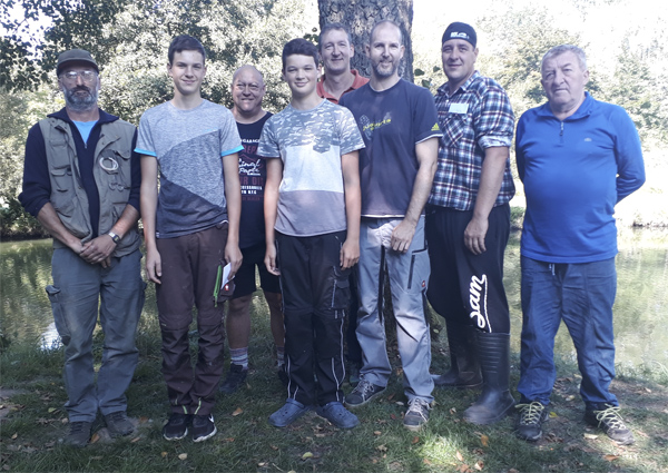 Sven Schmitter gewinnt letztes Fischen der Saison - Dominik Peldszus Sieger der JugendwertungMit der Teilnahme von 11 Altfischern und 4 Jungfischern beim Abfischen starteten die Anglerfreunde Arnschwang in die letzte offizielle Veranstaltung des Jahres. Am vereinseigenen Grillplatz konnte Vorstand Wolfgang Mühlbauer die Teilnehmer nach dem fünfstündigem Wettkampf begrüßen und die Sieger auszeichnen. Er dankte allen für ihr Mitwirken. Trotz idealen spätsommer Wetter konnten die Angler nur wenige Fangergebnisse vorweisen. Es wurden überwiegend Brachsen, Schleie und Rotauge gefischt. 7 Teilnehmer hätten etwas gefangen, so der Vorstand. Sieger bei den Altfischern wurde Sven Schmitter mit 5210 Gramm gefangenen Fischen. Auf Platz 2 folgte Matthias Bierl mit 3200 g vor dem drittplazierten Jürgen Leist (1120 g.). Alois Weißthanner (660 g) und Andreas Bierl (600 g) belegten die weiteren Plätze. Bei den Jungfischern konnte nur Dominik Peldszus (1500 g) und Sebastian Bierl (200 g) eine Fang vorweisen. Im Anschluß saß man in geselliger Runde bei Grillfleisch und Getränken gemütlich am Grillplatz zusammen. ![]() Bild von links: Vorstand Wolfgang Mühlbauer, Dominik Peldszus, Jürgen Leist, Sebastian Bierl, Andreas Bierl, Matthias Bierl, Sven Schmitter und Alois Weißthanner