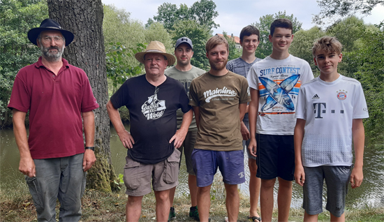Stefan Buchinger Fischerkönig 2020 - Sebastian Bierl gewinnt JungfischerwertungZum Königsfischen der Anglerfreunde Arnschwang waren am vergangenen Samstag und Sonntag bei herrlichem Sommerwetter 16 Altfischer und 3 Jungfischer angetreten. Es konnten sehr gute Fangergebnisse erzielt werden. Über 15 Karpfen und mehrere Brachsen und Rotaugen wurden gefangen. Stefan Buchinger konnte sich schließlich mit einem 6100 g schweren Karpfen den Fischerkönigstitel 2020 holen. Bei den Jungfischern siegte Sebastian Bierl mit einem 2840 g schweren Karpfen. Beim Abwiegen dankte Wolfgang Mühlbauer, der 1.Vorsitzende der Anglerfreunde Arnschwang nach dem 2-tägigen Wettbewerb für die zahlreiche Teilnahme und gratulierte den Siegern zu ihrem Erfolg. 12 Altfischer und alle teilnehmenden Jungfischer kamen in die Wertung. Beim Königsfischen kam es zu folgendem Ergebnis: Stefan Buchinger holte sich mit einem 6100 g schweren Karpfen die Siegertrophäe 2020. Rudi Schönberger sen., wurde mit einem 4140 g schweren Karpfen 1. Ritter. Mit einem 3900g schweren Karpfen wurde Matthias Christl 2. Ritter. Auf den nächsten Plätzen folgten Reinhold Buchinger (Karpfen 3380 g), Martin Ziegler (Karpfen 3160 g), Andreas Bierl (Karpfen 2860 g), Peter Berzl (Karpfen 2600 g), Daniel Konadl (Karpfen 2100 g), Reinhold Christl (Karpfen 1560 g), Ehrenvorstand Alois Weißthanner (Karpfen 1180 g), Patrick Köther (Brachse 660 g), Wolfgang Mühlbauer (Brachse 440 g) Jungfischerkönig mit einem 2840 g schweren Karpfen wurde Sebastian Bierl, 1. Ritter Felix Perlinger (1000 g Brachse), 2. Ritter Dominik Peldszus ( 920 g Brachse). Bei Grillfleisch, Würstchen vom Grill und erfrischenden Getränken saßen die Anglerfreunde anschließend gemütlich an ihrem Grillplatz zusammen und feierten mit den Würdenträgern. Die offizielle Preisverleihung findet zwecks der Covid-19 Pandemie erst bei der Jahreshauptversammlung statt. Vorstand Wolfgang Mühlbauer; Rudi Schönberger sen; Matthias Christl; Fischerkönig Stefan Buchinger; Dominik Peldszus; Jungfischerkönig Sebastian Bierl und Felix Perlinger (von links)