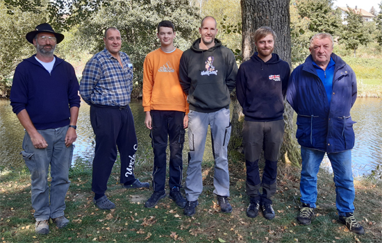 Stefan Buchinger gewinnt Abfischen - Sebastian Bierl gewinnt JungfischerwertungDie Sieger beim diesjährigen Abfischen der Anglerfreunde Arnschwang heißen Stefan Buchinger mit 16880 g gefangenen Fischen bei den Altfischern und Sebastian Bierl mit 420 g gefangenen Fischen bei den Jungfischern. Nur 9 Altfischer und 2 Jungfischer der Arnschwanger Anglerfreunde nahmen am Abfischen, der letzten offiziellen Veranstaltung der Saison, teil. Bei Anfangs kühlem Herbstwetter gingen nicht gerade viele Fische an den Haken. Vorstand Wolfgang Mühlbauer zeigte sich etwas entäuscht, dass sich nur 11 Anglerfreunde am letzten Wettbewerb der Saison beteiligten, dankte den Teilnehmern und zeichnete die Sieger aus. Den 1. Platz belegte Stefan Buchinger mit 16880 g (3 Karpfen). Platz 2 konnte sich Matthias Bierl mit (2770 g 3 Brachsen, Schleie und Rotfeder) sichern. 3. Sieger wurde Sven Schmitter mit 2320 g (Karpfen und 2 Rotaugen). Alois Weißthanner wurde mit dem 4. Preis für zwei Brachsen mit 2020 g ausgezeichnet. Auf den nächsten Platz folgte Rudi Schönberger (1080 g Brachse und 2 Rotfedern). Bei den Jungfischern siegte Sebastian Bierl mit 420 g (Brachse). Am Grillplatz saß man nach dem Abwiegen in gemütlicher Runde bei Grillfleisch und Getränken zusammen. Vorstand Wolfgang Mühlbauer; Sven Schmitter; Jungfischersieger Sebastian Bierl; Matthias Bierl; Stefan Buchinger; Alois Weißthanner (von links)