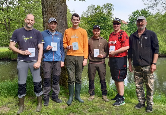 Sven Schmitter Sieger beim Hegefischen - Anglerfreunde konnten zahlreiche gefangene Fische präsentierenBei trockenem, aber windigem Frühlingswetter beteiligten sich 13 Anglerfreunde, darunter jedoch nur ein Jungfischer am vergangenen Sonntag von 5.00 Uhr bis 10.00 Uhr am diesjährigen Hegefischen. Bei angenehmen Temperaturen wurden vorwiegend Karpfen, Rotaugen, Brachsen, Schleien und Forellen gefangen. Wolfgang Mühlbauer, der Vorsitzende der Anglerfreunde nahm am vereinseigenen Grillplatz nach dem Wettkampf die Siegerehrung vor. 5 Altfischer konnten zahlreiche gefangene Fische präsentieren. Sieger des Hegefischens und Gewinner eines Gutscheins mit 40 Punkten für 8620 g wurde Sven Schmitter. Auf den nächsten Plätzen folgten Stefan Buchinger (30 Punkte - 4820 g ), Matthias Bierl (25 Punkte - 4480 g), Matthias Christl (20 Punkte - 3700 g), Wolfgang Mühlbauer (560 Gramm). Sebastian Bierl siegte bei den Jungfischern mit zwei Schleien und einem Gesamtgewicht von 1240 Gramm. Vorsitzender Wolfgang Mühlbauer gratulierte den Siegern und dankte allen für die zahlreiche Teilnahme. Im Anschluss an das Hegefischen besuchten die Anglerfreunde das Hallenfest der FFW Nößwartling. Bild von links: Matthias Bierl, Matthias Christl, Jungfischer Sebastian Bierl, Stefan Buchinger, Sven Schmitter und Vorsitzender Wolfgang Mühlbauer |