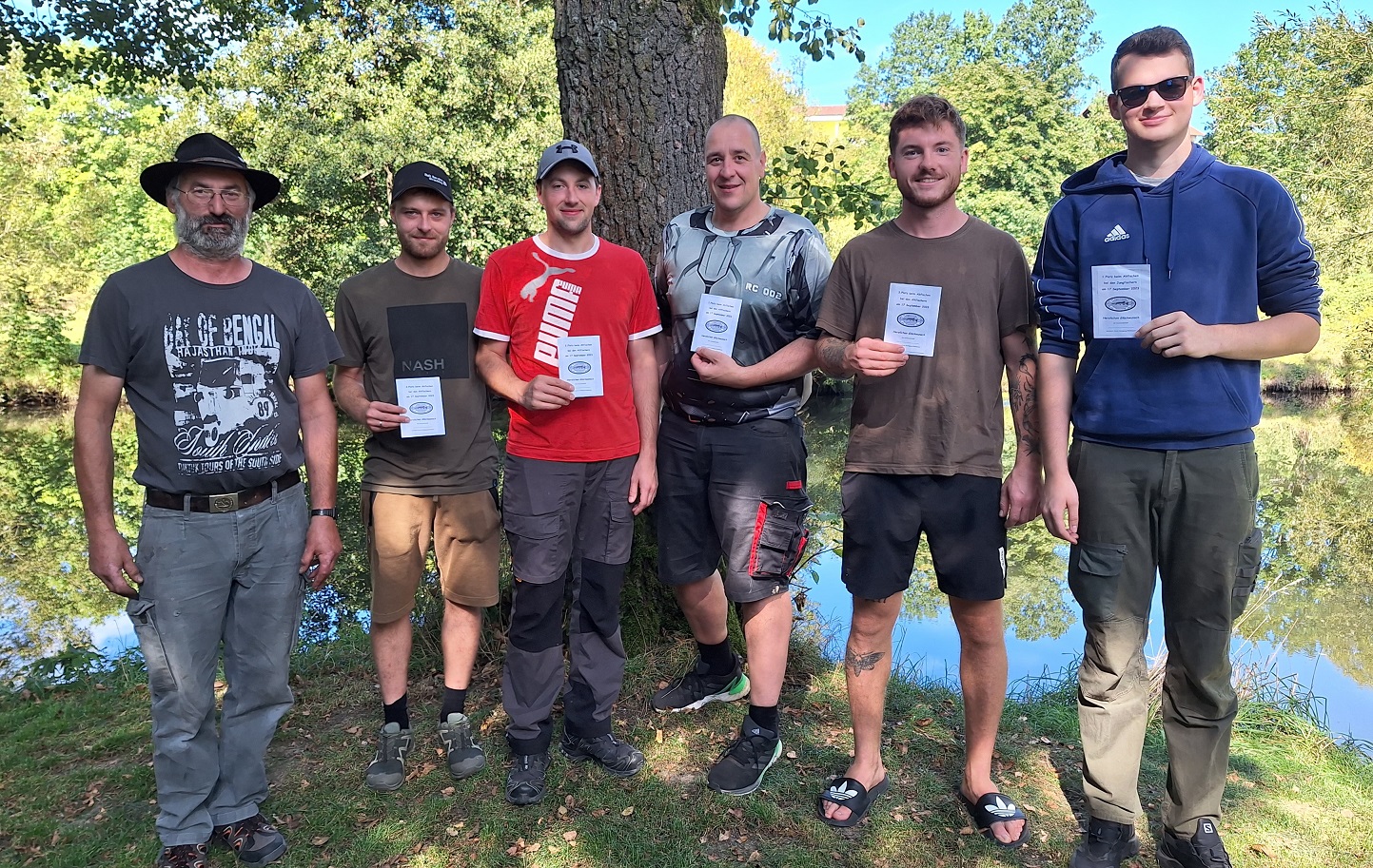 Sven Schmitter gewinnt letztes Fischen der Saison - Sebastian Bierl Sieger der Jugendwertung12 Altfischer jedoch nur ein Jungfischer folgten am vergangenen Sonntag der Einladung der Anglerfreunde Arnschwang zum Abschlussfischen um mit diesem Wettbewerb die Saison zu beenden. Zwischen 6 Uhr und 11 Uhr fanden sich die Petrijünger an die Chamb ein und genossen die zunehmenden angenehmeren Temperaturen und Sonnenschein. Die Fangquote war etwas dürftig, hatten doch nur vier Angler einen Fisch am Hacken. Kurz nach 11 Uhr fanden sich die Angler am Grillplatz zum Abwiegen ein. Karpfen, Brachsen, Rotaugen und ein Hecht wurden gefangen. Wolfgang Mühlbauer, der Vorsitzende der Anglerfreunde, begrüßte die Teilnehmer und dankte allen für ihr Engagement. Im Anschluß daran nahm er die Siegerehrung vor und überreichte die Punktekarten für die Gewinner. Sven Schmitter hatte sich mit sechs Brachsen und einem Gesamtgewicht von 5980 gr den Siegerplatz geholt. Den zweiten Platz belegte Matthias Christl mit 5440 Gramm vor Simon Schultz mit 1760 Gramm. Auf den vierten Platz folgte Stefan Buchinger mit 1160 Gramm. Die Jugendwertung entschied Sebastian Bierl mit einer 480 Gramm Rotauge für sich. Im Anschluss saß man in geselliger Runde bei Grillfleisch und Getränken gemütlich am Grillplatz zusammen. Bild v.l: Vorsitzender Wolfgang Mühlbauer, Stefan Buchinger, Matthias Christl, Sven Schmitter, Simon Schultz und Sebastian Bierl |