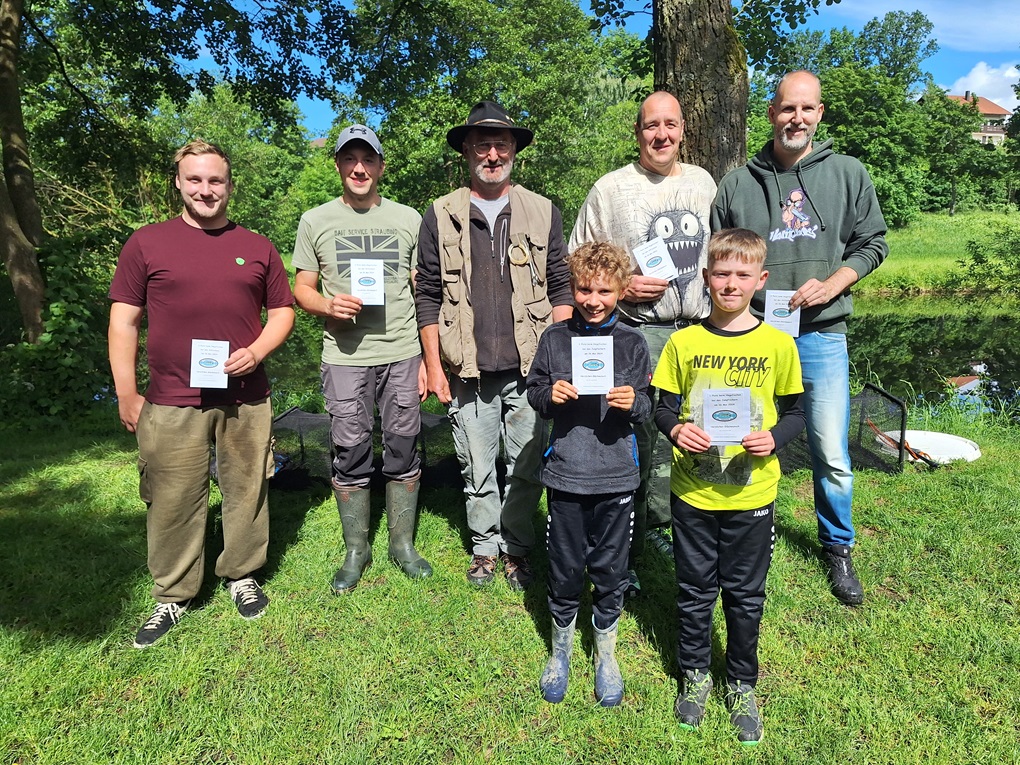 Sven Schmitter Sieger beim Hegefischen - Benjamin Rupprecht gewinnt Jungfischerklasse19 aktive Mitglieder, darunter zwei Jungfischer der Anglerfreunde Arnschwang beteiligten sich am vergangenen Sonntag von 5 Uhr bis 10.00 Uhr am diesjährigen Hegefischen. Bei schönem Frühlingswetter wurden neben Karpfen auch Brachsen, Rotaugen, Giebel und Forellen gefangen. Wolfgang Mühlbauer, der Vorsitzende der Anglerfreunde, nahm am Grillplatz die Siegerehrung vor. Sieger des Hegefischens mit insgesamt 4720 g wurde bei den Altfischern Sven Schmitter. Auf den nächsten Plätzen folgten Matthias Christl (3640 g), Marco Schönberger (2.880 g), Matthias Bierl (1160 g) und Martin Ziegler (520 g). Bei den Jungfischern siegte Benjamin Rupprecht mit einem 2720 Gramm schweren Karpfen vor Julian Berzl (Brachse 780 g). Vorstand Wolfgang Mühlbauer gratulierte den Siegern und dankte allen für die Teilnahme und wies auf anstehende Termine hin. Die Sieger erhielten für ihre Leistungen Gutscheine ausgehändigt. Im Anschluss saß man bei bei Grillfleisch, Würstchen und Erfrischungsgetränken gemütlich am Grillplatz zusammen. Bild von Links: Marco Schönberger, Matthias Christl, Wolfgang Mühlbauer, Julian Berzl, Sven Schmitter, Benjamin Rupprecht und Mattias Bierl. |