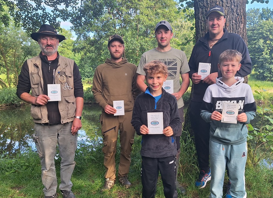 Matthias Christl Sieger beim Nachtfischen - Julian Berzl gewinnt JungfischerklasseBei sommerlichen Wetter konnten die Anglerfreunde am vergangenen Samstag beim alljährlichen Nachtangeln zahlreiche Fänge verbuchen. Karpfen, Giebel, Brachse, Aal, Rotauge und Hecht konnten die erfolgreichen Angler am Sonntagmorgen um 7 Uhr zum Abwiegen verzeichnen. 17 Teilnehmer, darunter 2 Jungfischer, begaben sich um 19:00 Uhr auf ihre Angelplätze. Gegen 16:00 Uhr traf man sich bereits beim Grillplatz zum kulinarischen Teil mit Grillfleisch und Bratwurst. Sieger des Nachtangelns wurde Matthias Christl mit einem Gesamtgewicht von 17600 g (1 Giebel, 4 Karpfen), gefolgt von Wolfgang Mühlbauer mit 7180 g (2 Hecht, Aal). Auf den weiteren Plätzen folgten Sven Schmitter (Hecht, Brachse, Karpfen), Stefan Buchinger, Alois Weißthanner und Rudi Schönberger jun. Bei den Jungfischer holte sich Julian Berzl mit einer Brachse 520 g den Sieg vor Benjamin Rupprecht der sich eine Rotfeder mit 140 g erangelte. Vorstand Wolfgang Mühlbauer nahm die Siegerehrung vor und gratulierte hierbei den erfolgreichen Teilnehmern zu ihren Fängen. Die Sieger wurden von ihm mit Punktekarten ausgezeichnet. Zum anstehenden Fischerfest am Samstag 6 Juli bat er alle Mitglieder um tatkräftige Unterstützung. Bild von Links: Bild von links: Wolfgang Mühlbauer, Stefan Buchinger, Julian Berzl, Matthias Christl, Sven Schmitter und Benjamin Rupprecht. |